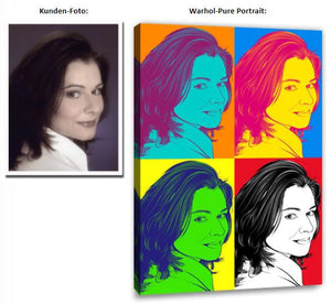 - Gratis Vorschau per E-Mail: Wir senden Ihnen das fertige Pop-Art Bild vorab als Vorschau-Bild zum Prüfen und zur Freigabe. Nach Ihrer Freigabe versenden wir das gedruckte Bild an Ihre Adresse
