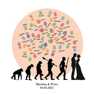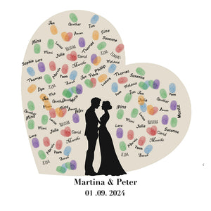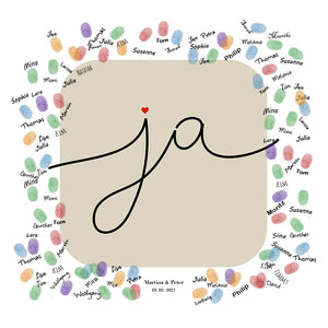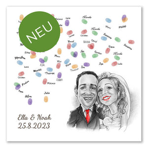 Das Konzept besteht darin, eine Leinwand mit einem vorgedruckten Motiv oder Design zu versehen, auf dem die Gäste ihre Fingerabdrücke als Teil des Kunstwerks hinterlassen können. Diese Fingerabdrücke lassen dann ein einzigartiges Kunstwerk entstehen, welches das Brautpaar als Erinnerung an ihren besonderen Tag aufbewahren kann.