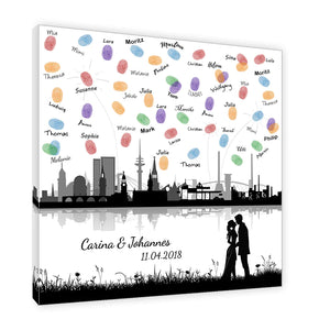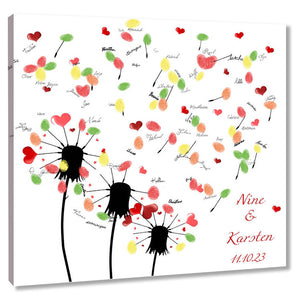 Durch die Fingerabdrücke der Gäste wird das schöne Motiv auf der Fingerabdruck – Leinwand immer weiter geschmückt. Mit unserer Leinwand hat das Paar immer eine wundervolle Erinnerung an die Hochzeit und gleichzeitig ein besonderes Bild zur Verzierung der eigenen vier Wände.
