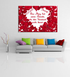 Schreiben Sie sich alles von der Seele und suchen eine passende Vorlage aus unseren Liebesbotschaften aus; wir inspirieren Sie gerne mit einer Vielzahl an Motiven und Ideen. Unsere Künstler setzen Ihre romantische Liebesbotschaft in der von Ihnen zuvor ausgesuchten Vorlage kunstvoll und geschickt ein. Mit diesem Geschenk kann man wirklich nichts falsch machen. Gedruckt auf eine schöne Künstlerleinwand mit Keilrahmen ist diese Geschenkidee ein hochwertiges Geburtstagsgeschenk für Verliebte, für Familien und für Paare - die Liebeserklärung schlechthin!